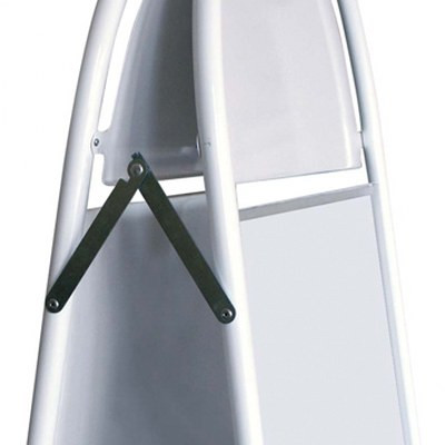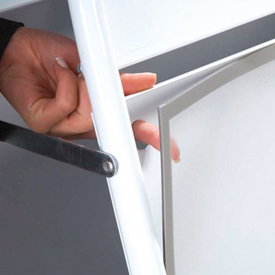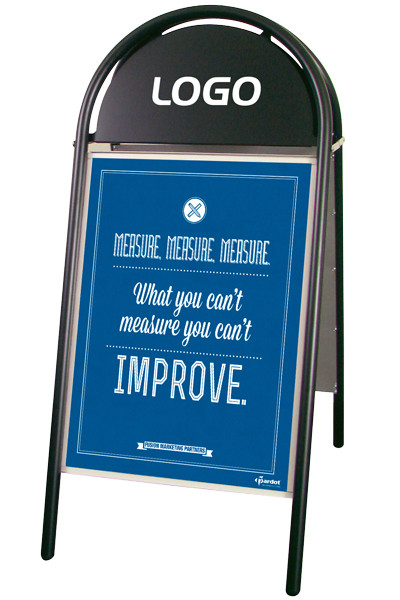 Kundenstopper mit Logotop. Aus 25 mm Stahlrohr, phosphatiert under polyesterlackiert produziert. Rostfreie und unlackierte Alu-Zink Rückplatten. Entspiegelten APET Frontplatten mit Magnet.