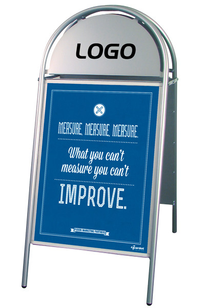 Kundenstopper mit Logotop. Aus 25 mm Stahlrohr, phosphatiert under polyesterlackiert produziert. Rostfreie und unlackierte Alu-Zink Rückplatten. Entspiegelten APET Frontplatten mit Magnet.