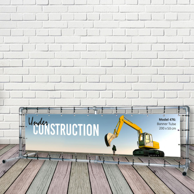Eine robuste Außenbannersystem aus kräftige 3 mm / Ø 48 mm Aluminium Röhre. Freistähender Wand mit Füße für Präsentation von PVC-Banners im Großformat.